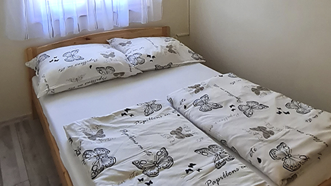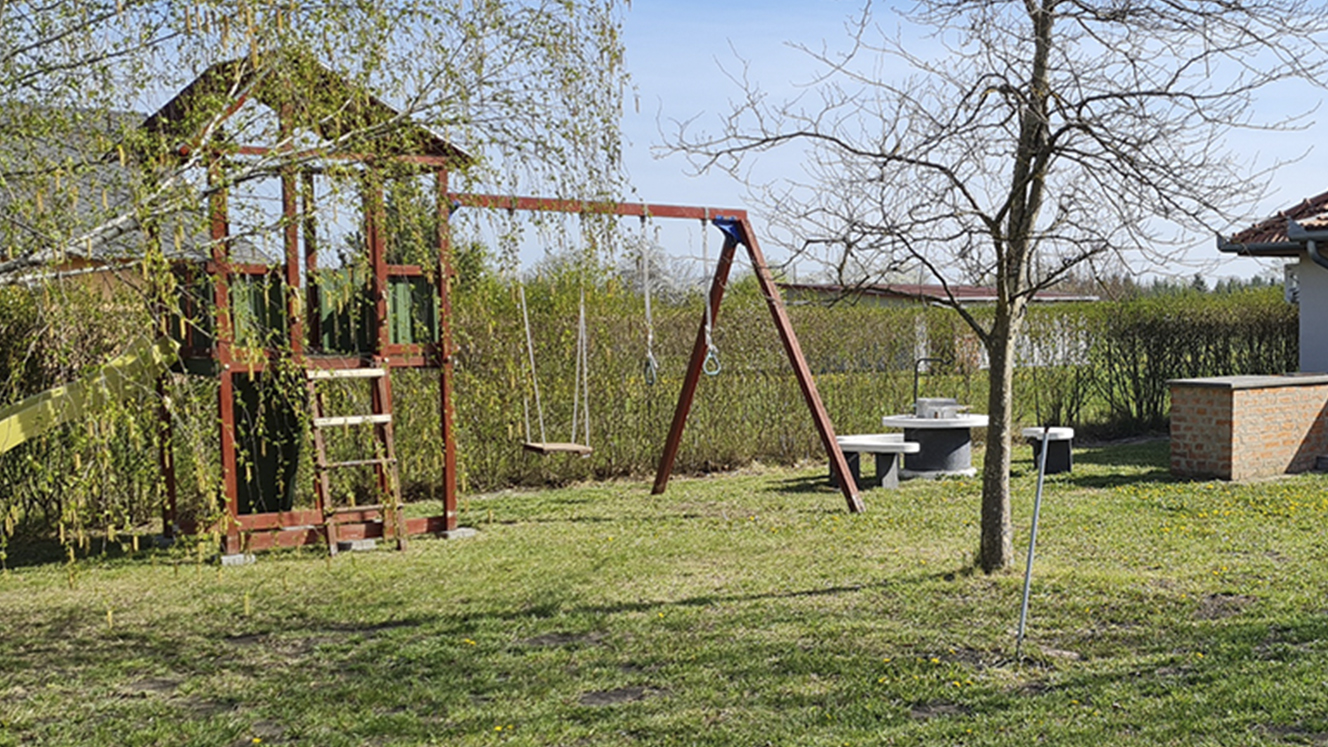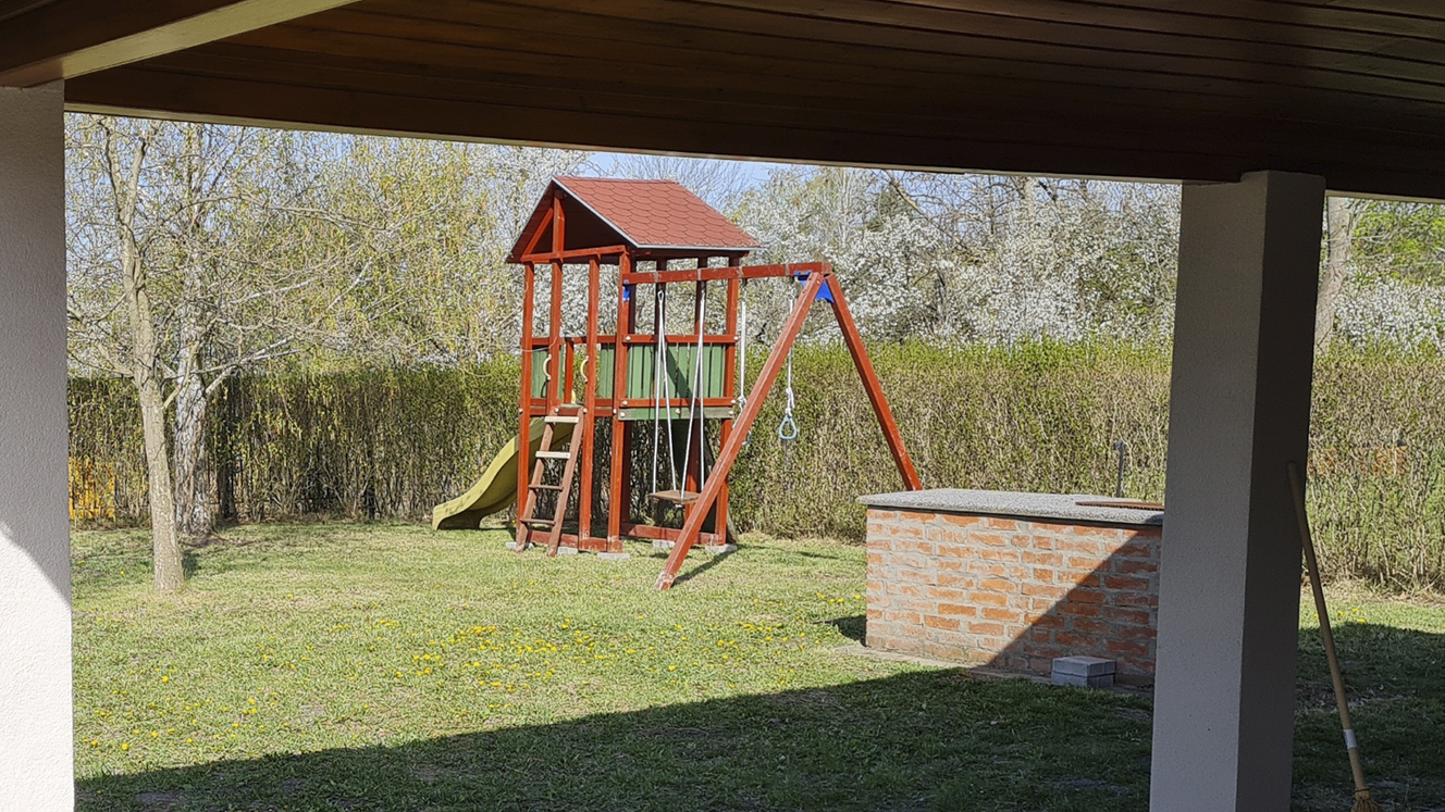 A kisebbik nyaralónk, földszintes, klímás. Az épület alapterülete: 60 m2. 3 szoba található (1 db kétágyas szoba, 2 egyágyas kétszemélyes ). Saját vízparti stég tartozik csónakkal. A kertben bográcsozási lehetőség. Zárt udvarral.